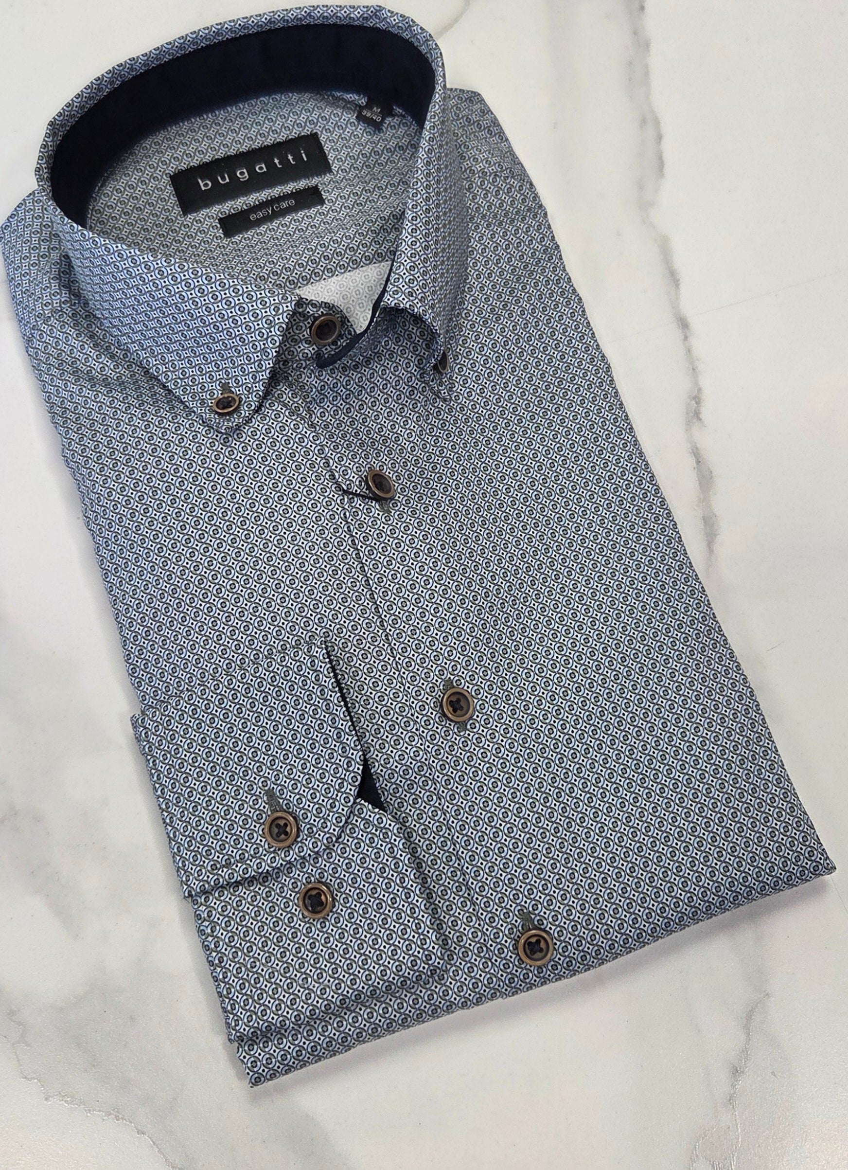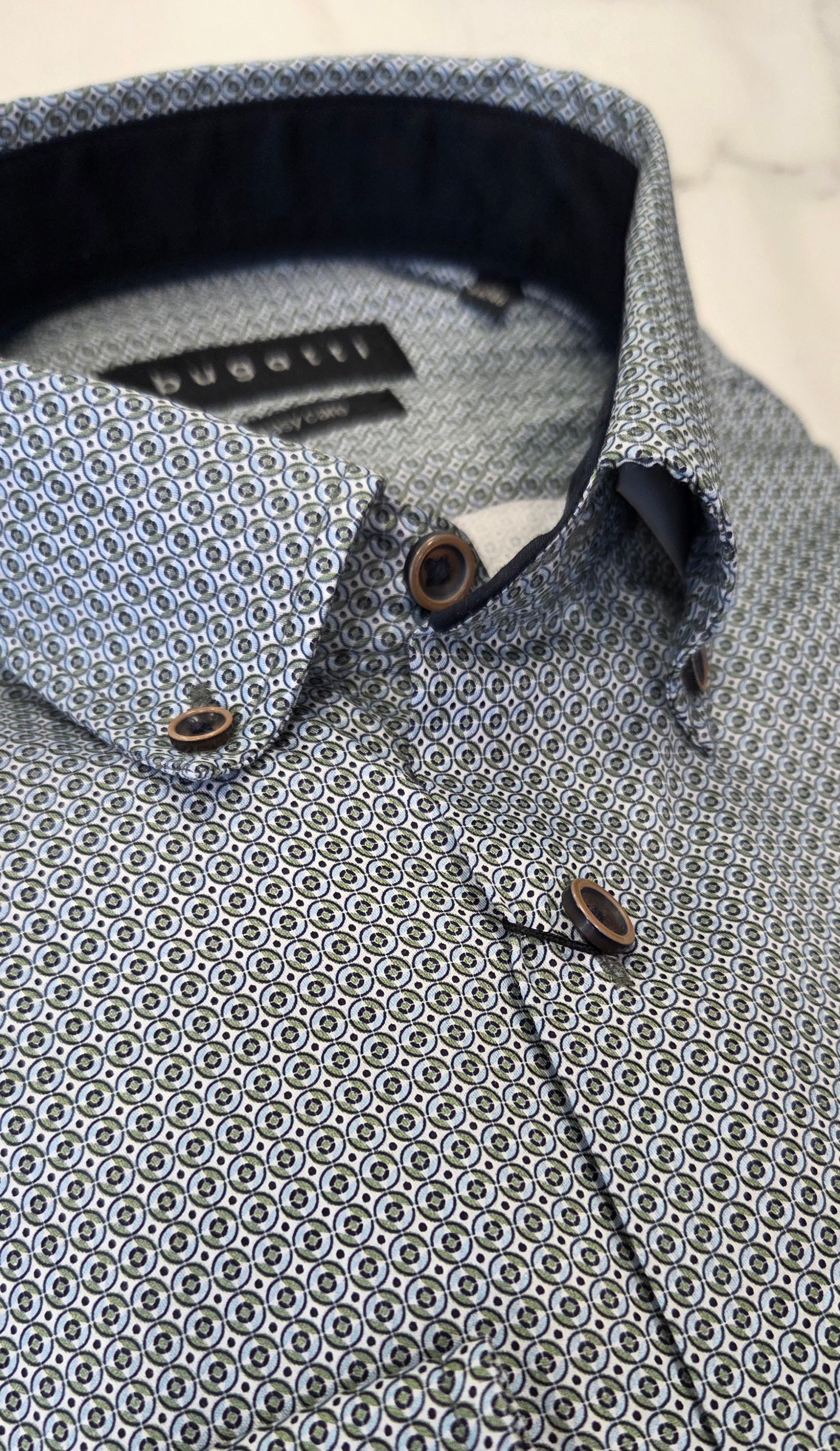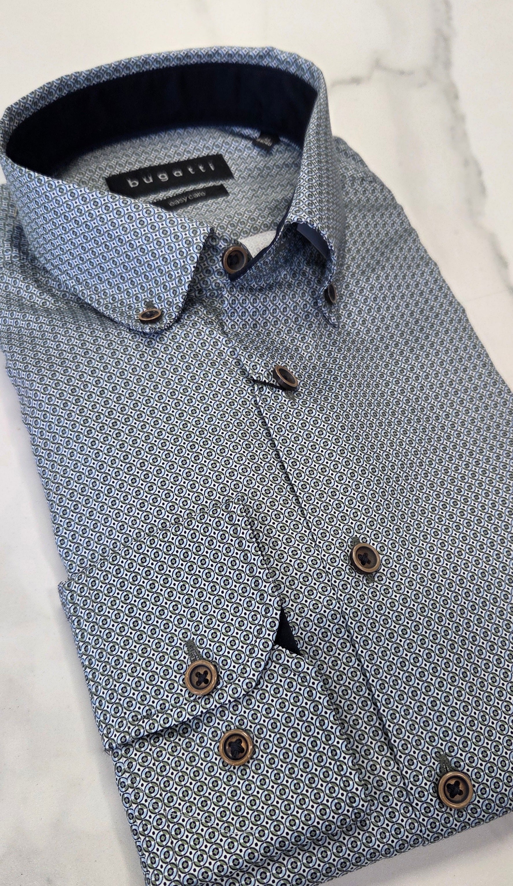 Discover the bugatti shirt – a classic with a modern twist! Made from 100% cotton, this shirt features an elegant button-down collar and all over pattern . With its slim-fitting design you'll always be in style, even on the go. The square 2-button cuffs and bugatti flag label act as additional accents.