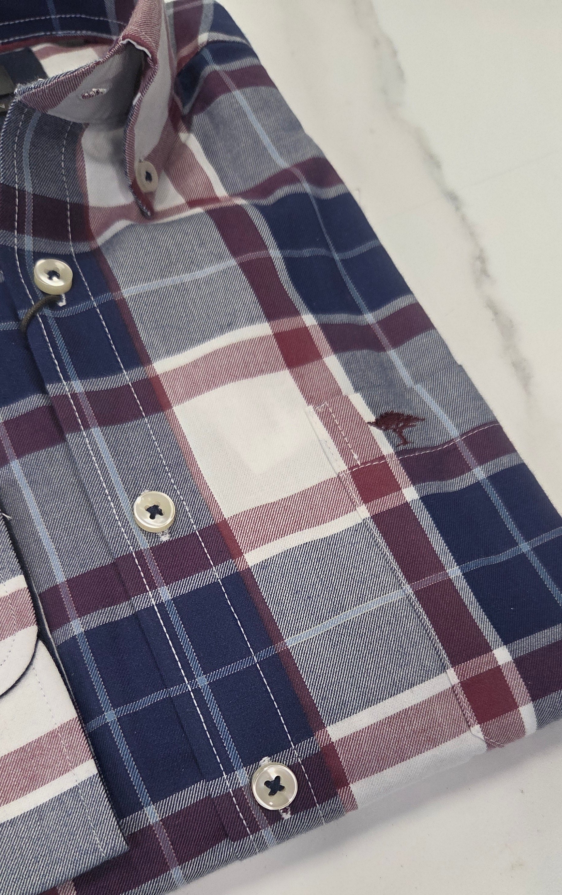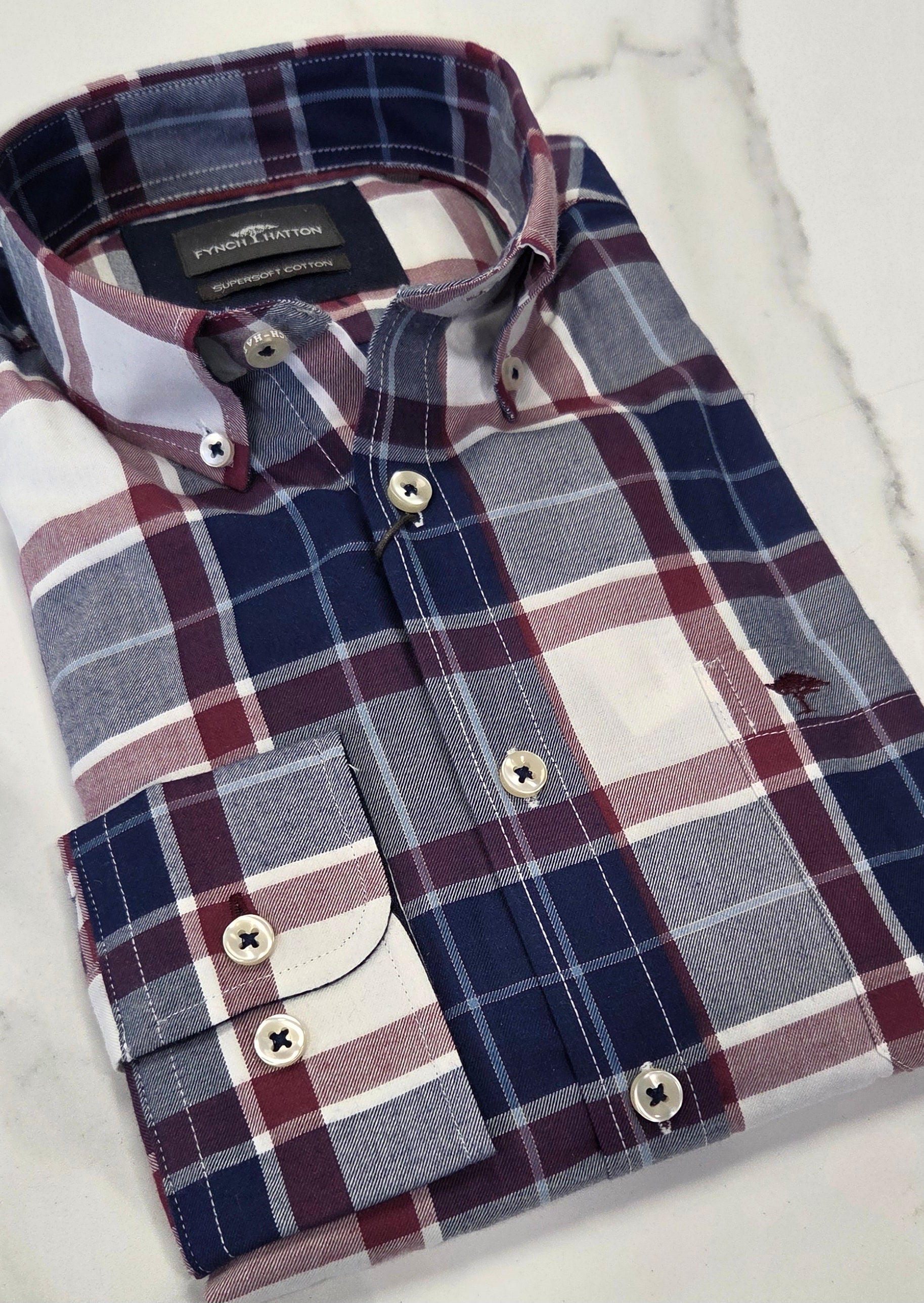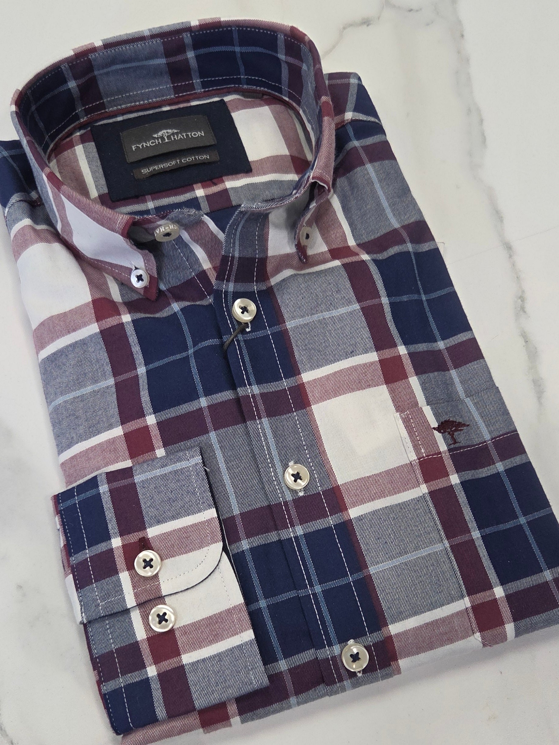 FYNCH HATTON CHECK L/S SHIRT - NAVY/WINE