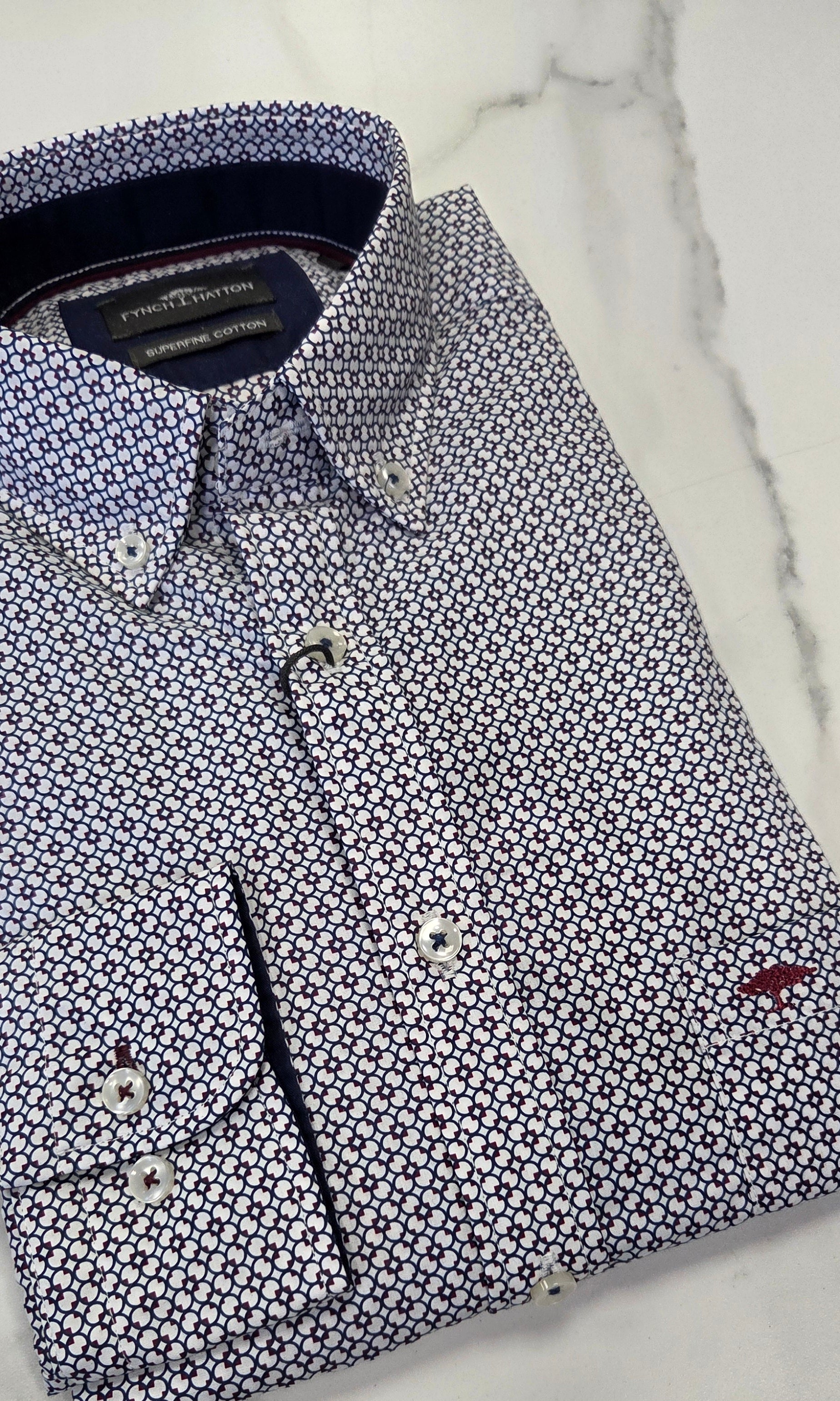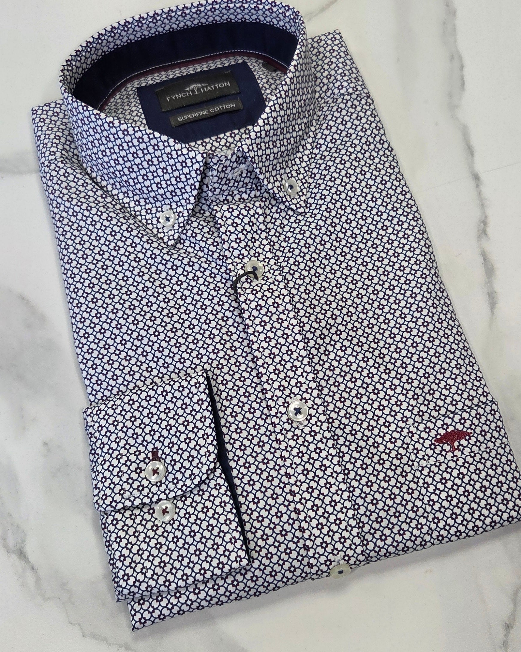 FYNCH HATTON GEOMETRIC PRINT L/S SHIRT - WHITE/WINE